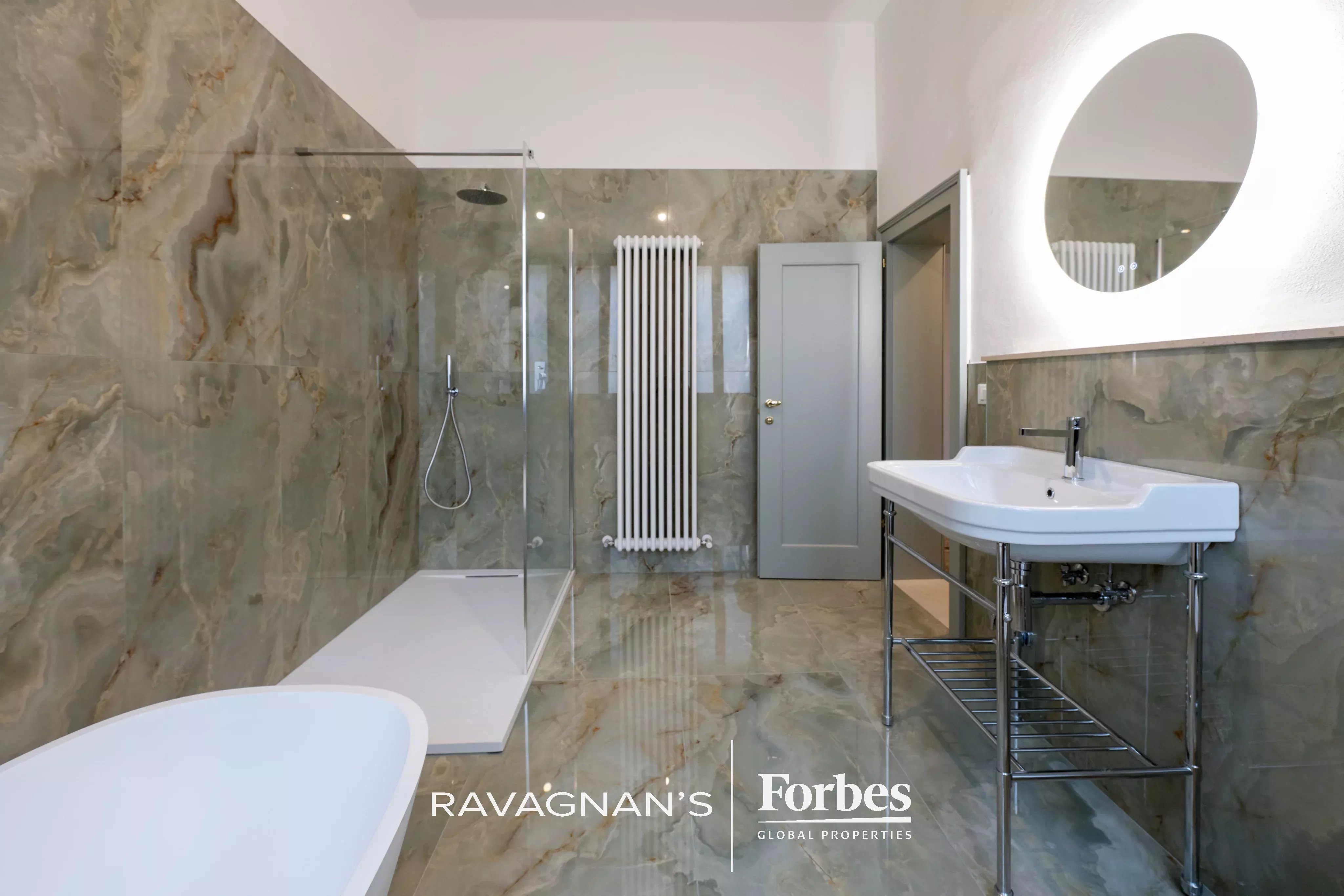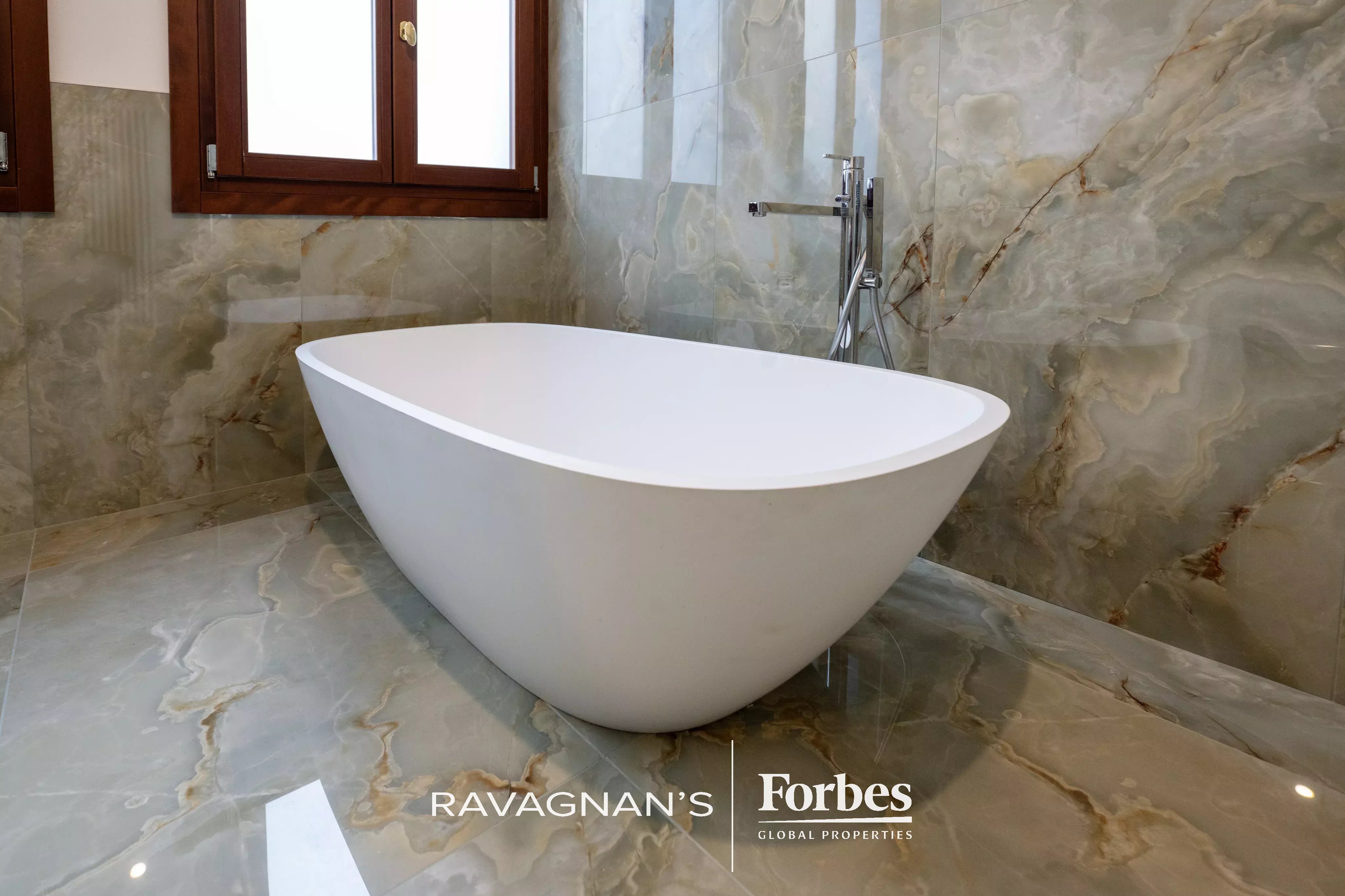 The property is completed by two windowed bathrooms, finely finished, one of which is enhanced by a striking designer bathtub.