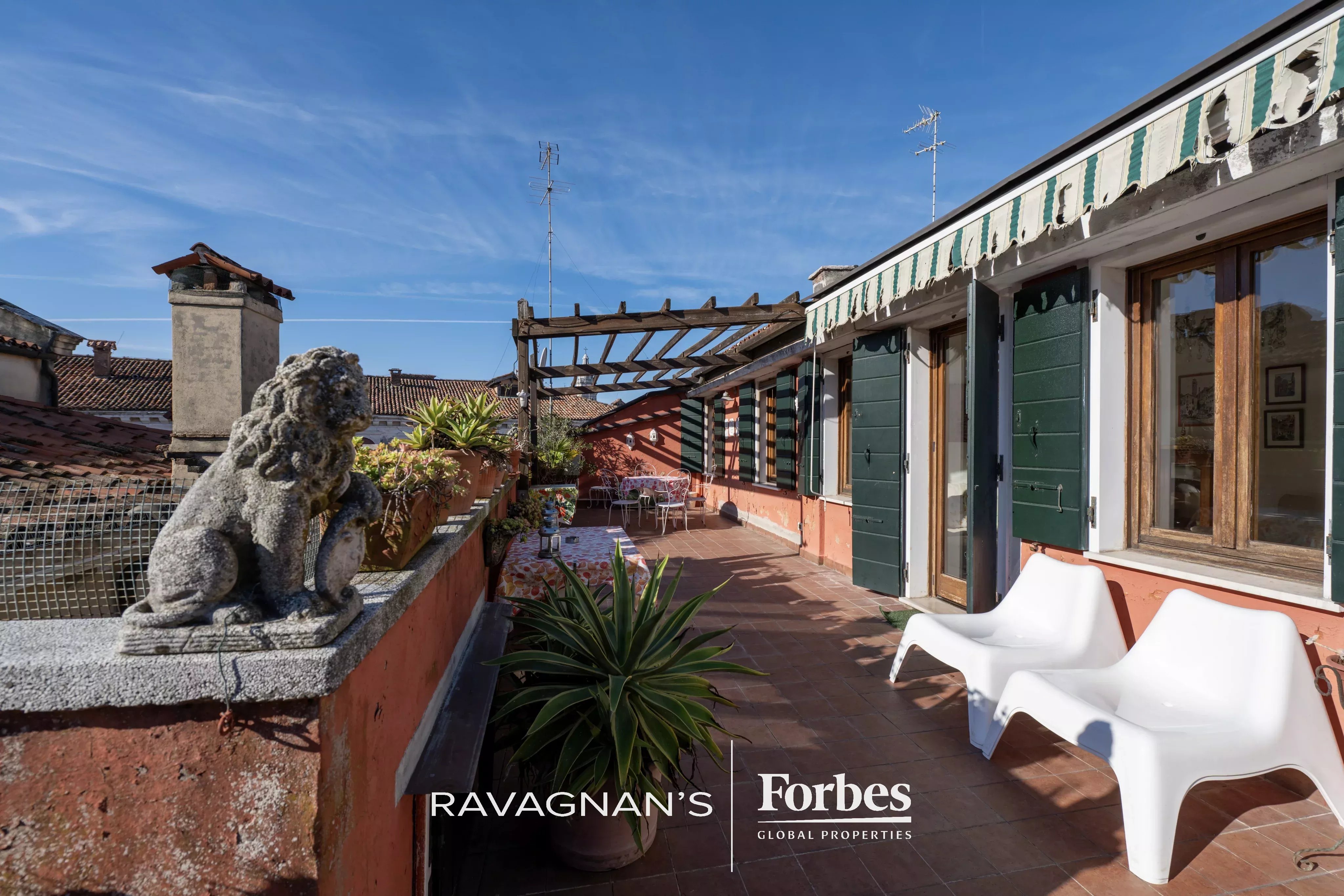 The property boasts three magnificent terraces, offering breathtaking views over the Venetian rooftops and delightful glimpses of the nearby waterways.